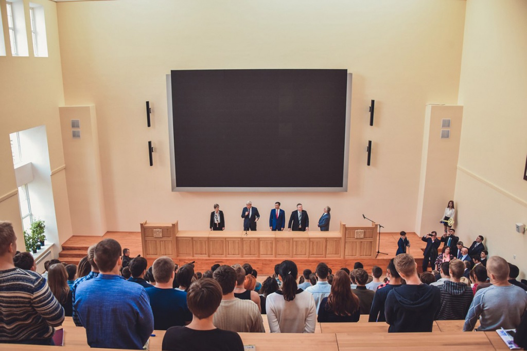А.И. РУДСКОЙ принял участие в еще двух поистине исторических событиях, приуроченных к празднованию 110-летия ЮРГПУ (НПИ), – открытии памятника у главного здания вуза и открытии после реконструкции Первой математической аудитории в здании Энергетического факультета. Все, кто принимал участие в реализации этого проекта, а также многочисленные гости, друзья, партнеры и, конечно, студенты университета стали первыми гостями обновленной аудитории, которая теперь получила статус высокотехнологичного лекционного зала. Техническое оснащение, установленное в помещении, позволит не только читать лекции и транслировать любые изображения на имеющийся здесь экран высокого разрешения, но и устанавливать моментальную связь фактически с любым университетом мира. Благодаря этому студенты и сотрудники ЮРГПУ (НПИ) получили возможность слушать лекции ведущих профессоров России и мира.