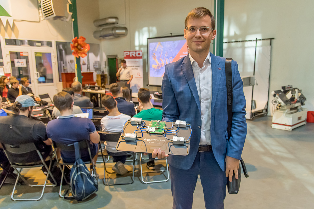 Инженер «ЮЕ-Интернейшнл» рассказал резидентам ФабЛаба о компании и ее продуктах. Студентам подарили комплект для лабораторных работ UVNA-63 от Mini-Circuits, включающий в себя все необходимые предметы для создания полнофункционального векторного анализатора цепей, а также тележку с инструментами RS Pro trolley tool kt от RS PRO, подобранными с учетом всех потребностей будущих инженеров.
